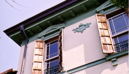外観は、バルコニーの柱にギリシャ建築の洋式を取り入れ、