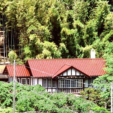 赤い瓦屋根とハーフティンバー。木々の緑に映えます。 |