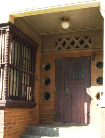 1階だけに貼られたスクラッチタイル、きれいな装飾を施した窓格子。