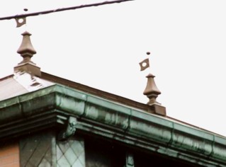 また、寄せ棟型の屋根の上に2つ、日章旗の飾りがついていますが、