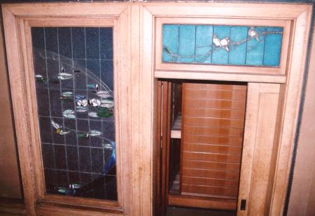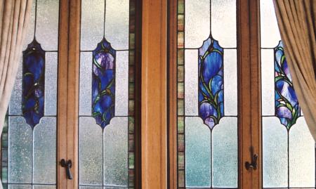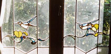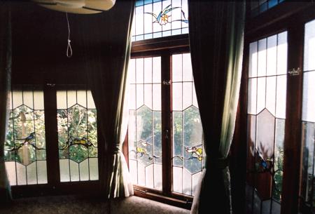 室内最大の見せ場、2階のベイ・ウィンドウ。ガラス6面に小鳥たちが戯れています。