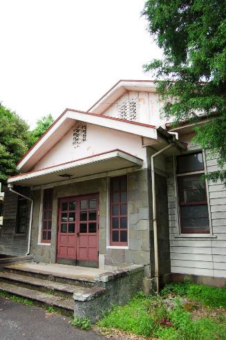一方の講堂の方は平屋建てで、シンプルですが、鉄平石の貼られた玄関はなかなか趣きがあります。