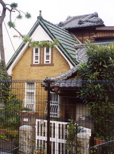 特注で作ったといわれる緑のフランス瓦と薄茶のスクラッチタイルの妙。